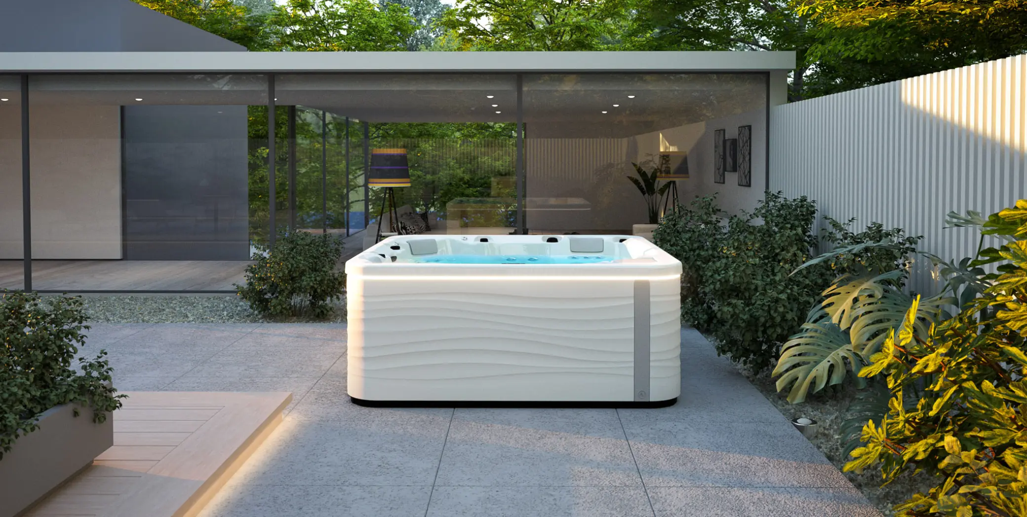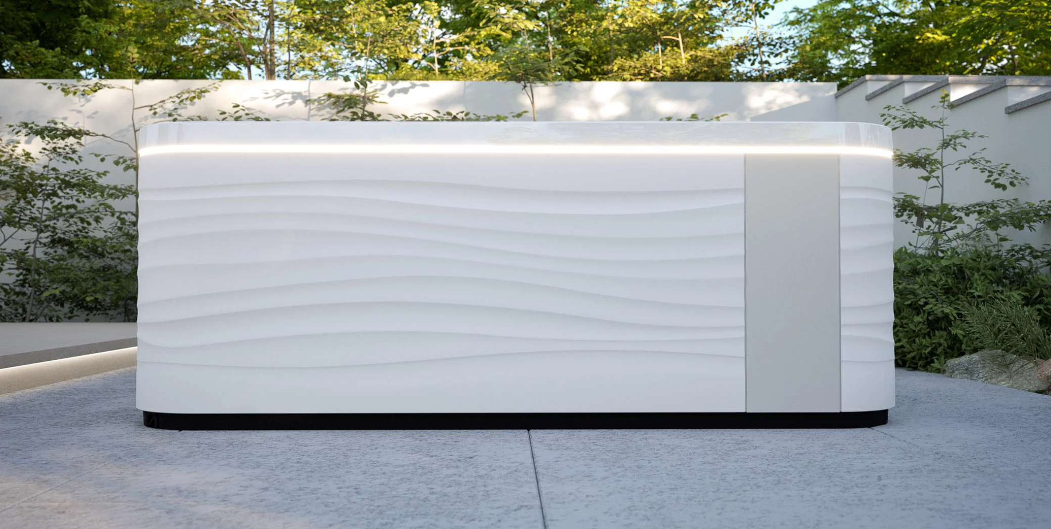 Líneas orgánicas, proporciones equilibradas y una presencia elegante que transforma el spa en una pieza de arquitectura contemporánea. El mueble ha sido diseñado para aportar luminosidad, sensación de amplitud y armonía visual, integrándose con naturalidad tanto en exteriores modernos como en espacios interiores de alto nivel.