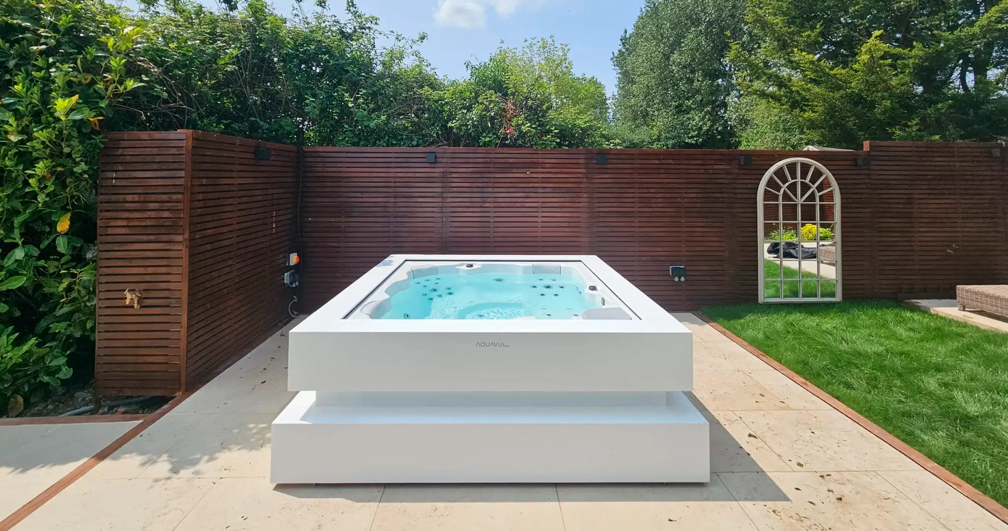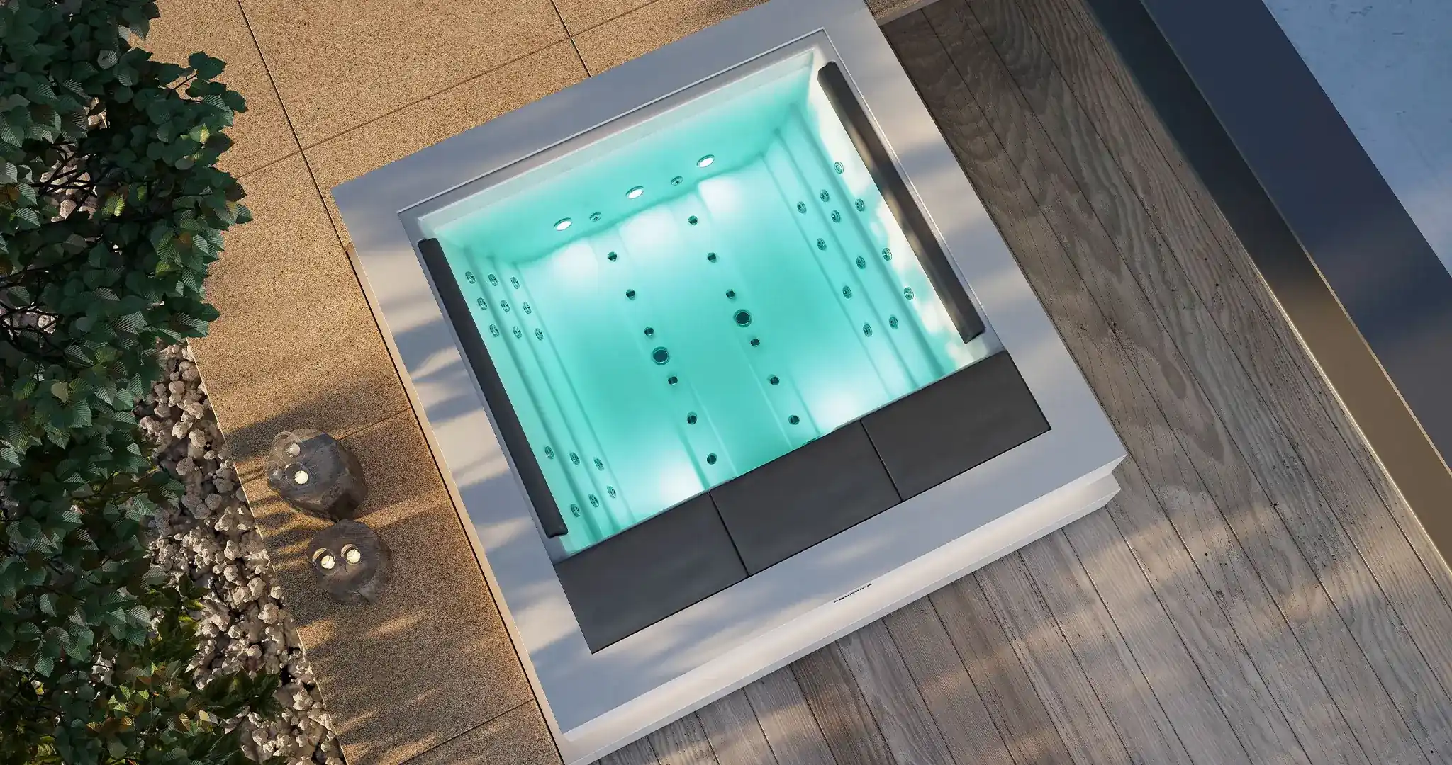 Entorno relajante: Añadir iluminación ambiental, música suave, aromas naturales o aceites esenciales y elementos como velas, pérgolas o plantas puede potenciar la experiencia sensorial, convirtiendo tu jacuzzi en un auténtico refugio de bienestar.