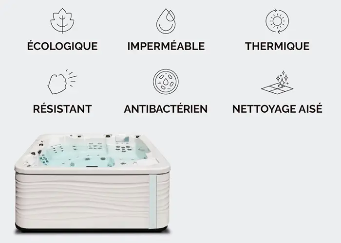 Aurora är resultatet av flera månaders forskning, utveckling och innovation. Alla dessa ansträngningar har lett till designen av ett skåp tillverkat av växtbaserat avfall, vilket minimerar miljöpåverkan från våra spabad. Det är tillverkat av polyuretanskum som respekterar ekosystemet tack vare sin miljövänliga teknik.